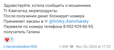 «Камчатка морепродукты»: отзывы о проекте, разоблачение скам-магазина в ТГ и мошенника Dmitry kamchatka fish