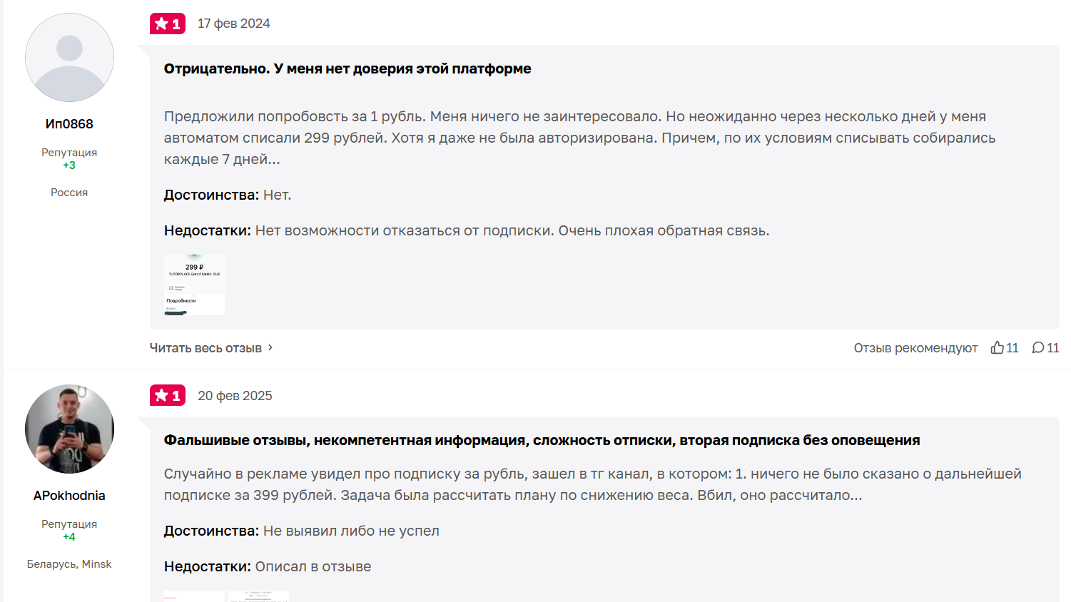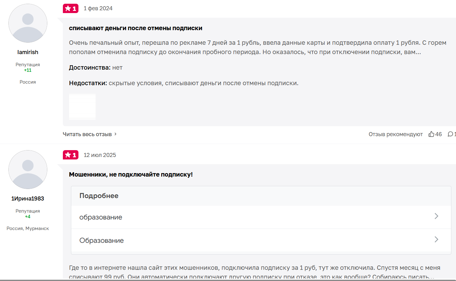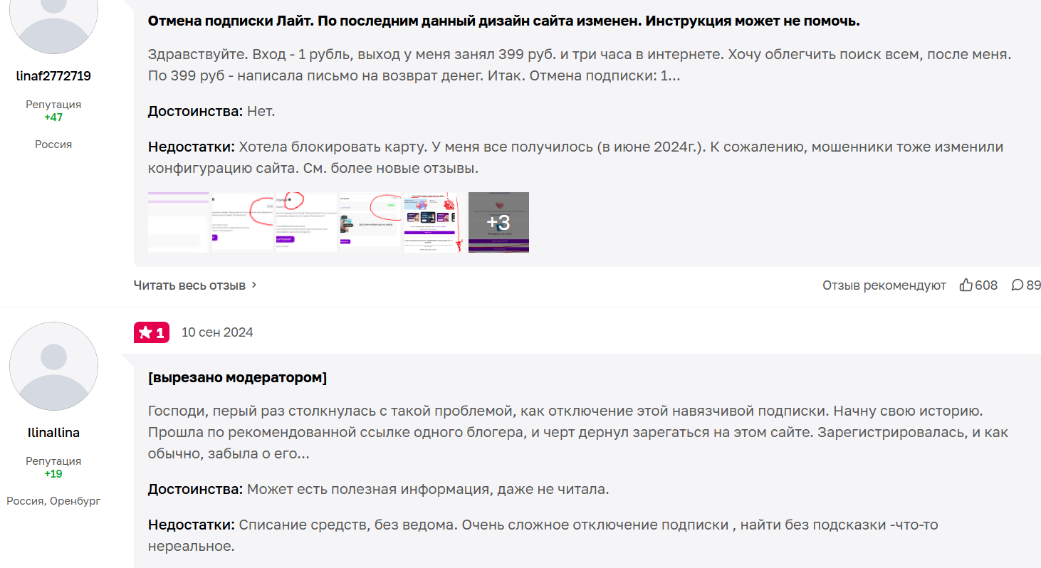 Самый распространенный сценарий, когда человек оформляет подписку за ₽1, потом забывает о платформе, а через несколько дней с его счета списывается ₽299 или ₽399. Многие пишут, что отменить подписку не просто и это квест с привлечением службы поддержки.