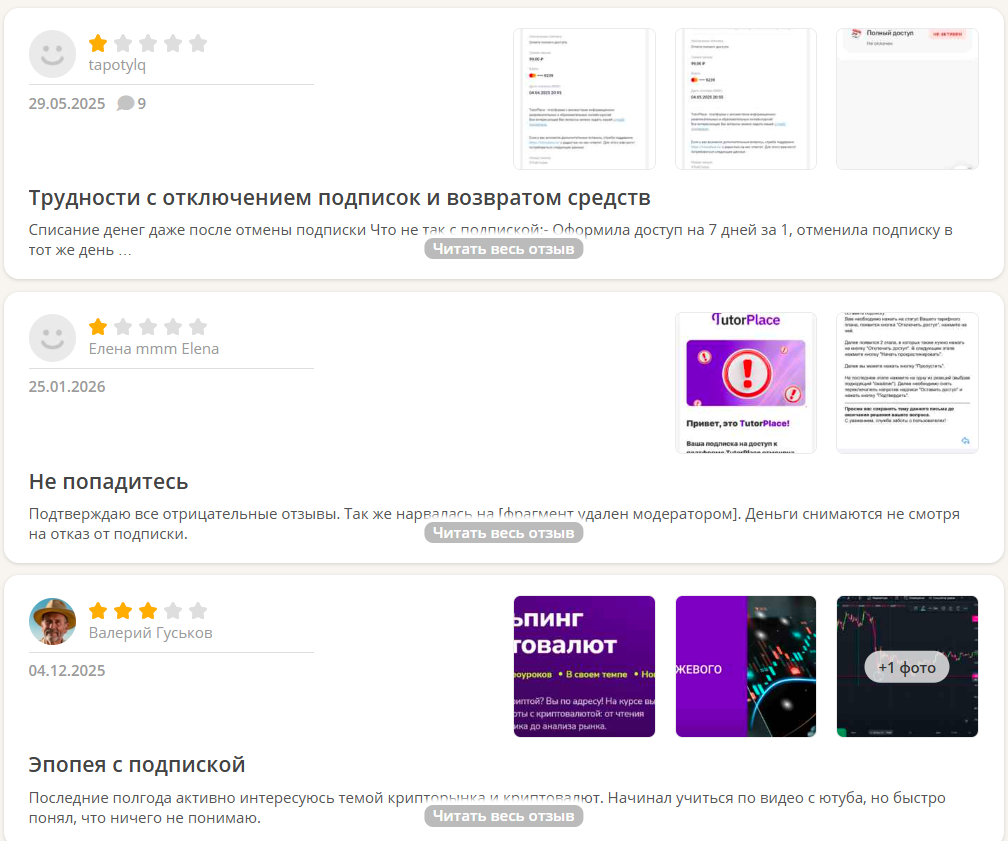 В сети нет ни одного отклика о боте, но много отзывов о площадке TutorPlace, куда робот перенаправляет клиентов. Чаще всего люди жалуются на проблемы с подпиской.