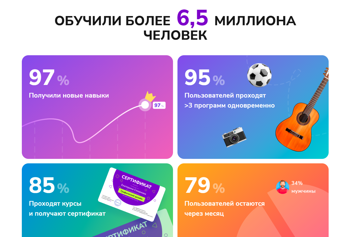 Клиенту обещают заработок ₽10,000 на нейросетях с помощью онлайн-курсов. На сайте цепляющие взгляд цифры о том, что обучение прошли 6 500 000 человек и 97% получили новые навыки. Подтверждений проект не размещает.