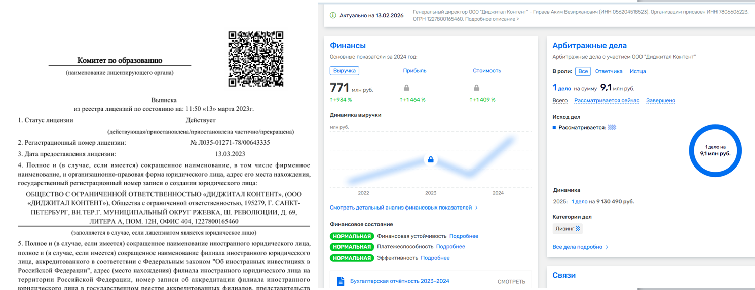 По данным RusProfile у ООО «Диджитал контент» есть образовательная лицензия, за компанией не числится судебных разбирательств и финансовые показатели за 2024 год говорят о росте прибыли на 1 464%.