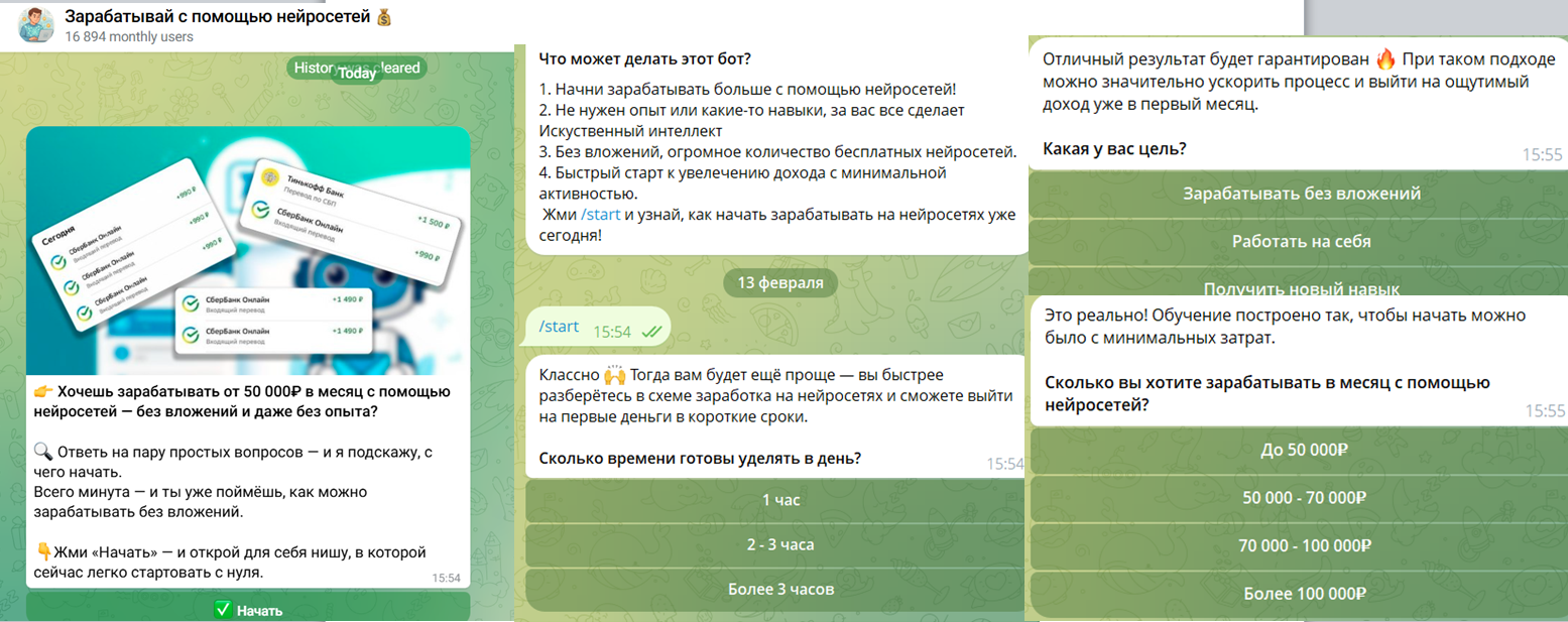 По данным «Телеграмм» на февраль 2026 года у бота 16 894 пользователей. Сразу после старта MakeCashOnAI bot задает ряд вопросов по целям дохода, объему времени, которое клиент готов уделять заработку, и навыкам пользователя. Бот пишет о том, что с его помощью можно зарабатывать от ₽50,000 без вложений.