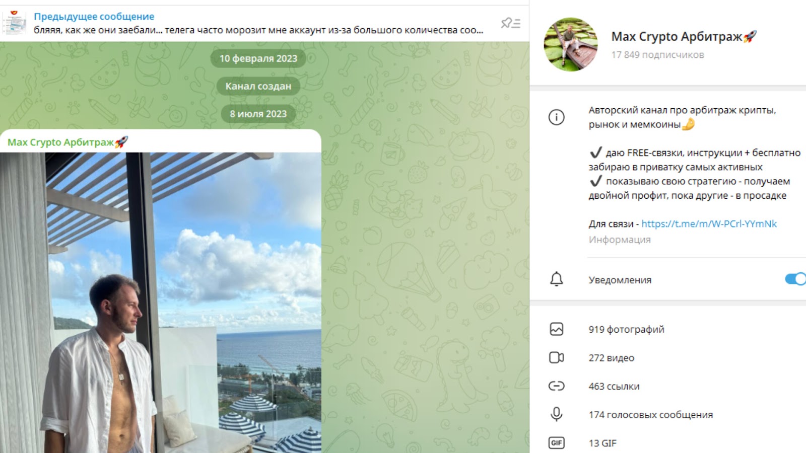 На аккаунте и в сообществе рассматриваемый арбитражник использует чужие фотографии и ничем не подтверждает уровень профессионализма. Сейчас Телеграмм канал перестал функционировать, но ранее Максим продвигал сомнительные обменники для работы. Из других фактов о проекте мы отметили: