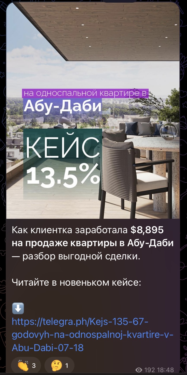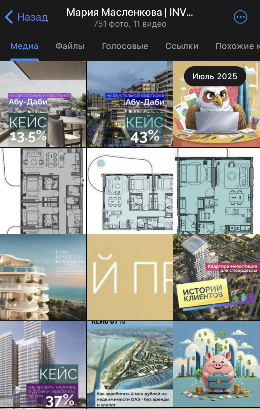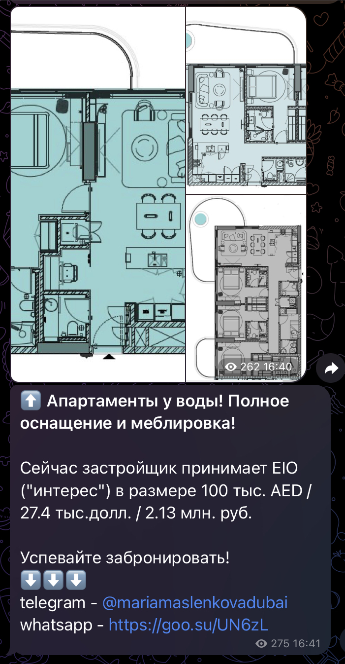 Контент делится на:- информационные посты и советы на тему дубайской недвижки;