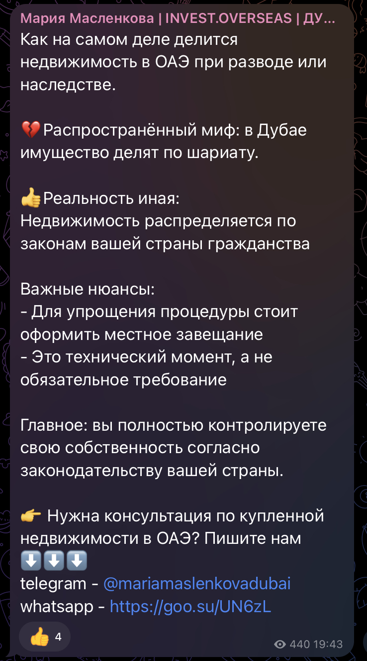 Чтобы получить консультацию в качестве клиента или инвестора, предусмотрен ТГ аккаунт Maria Maslenkova, который можно найти по нику mariamaslenkovadubai. Профиль создан без фото и описания.