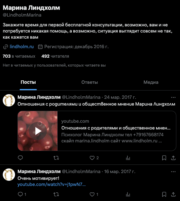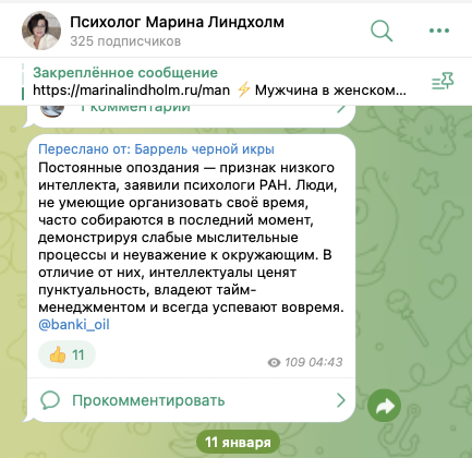 На тг-канал «Психолог Марина Линдхолм», lindholmm, на 22 января 2025-го года, подписано 325 пользователей. Публикации просматривают в среднем по 100 раз.