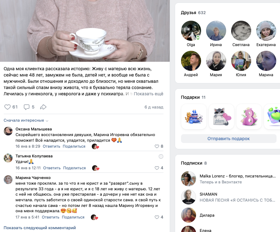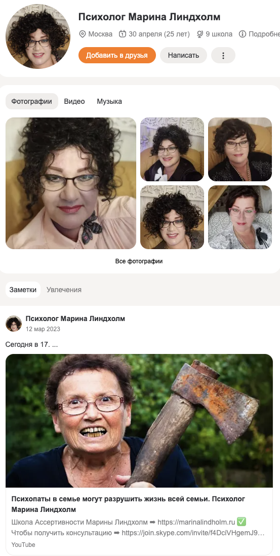 На страницу психолога в соцсети «Одноклассники» около 2,5 тысяч друзей. Однако, новый контент на ней не выходит почти два года — с середины марта 2023-го.