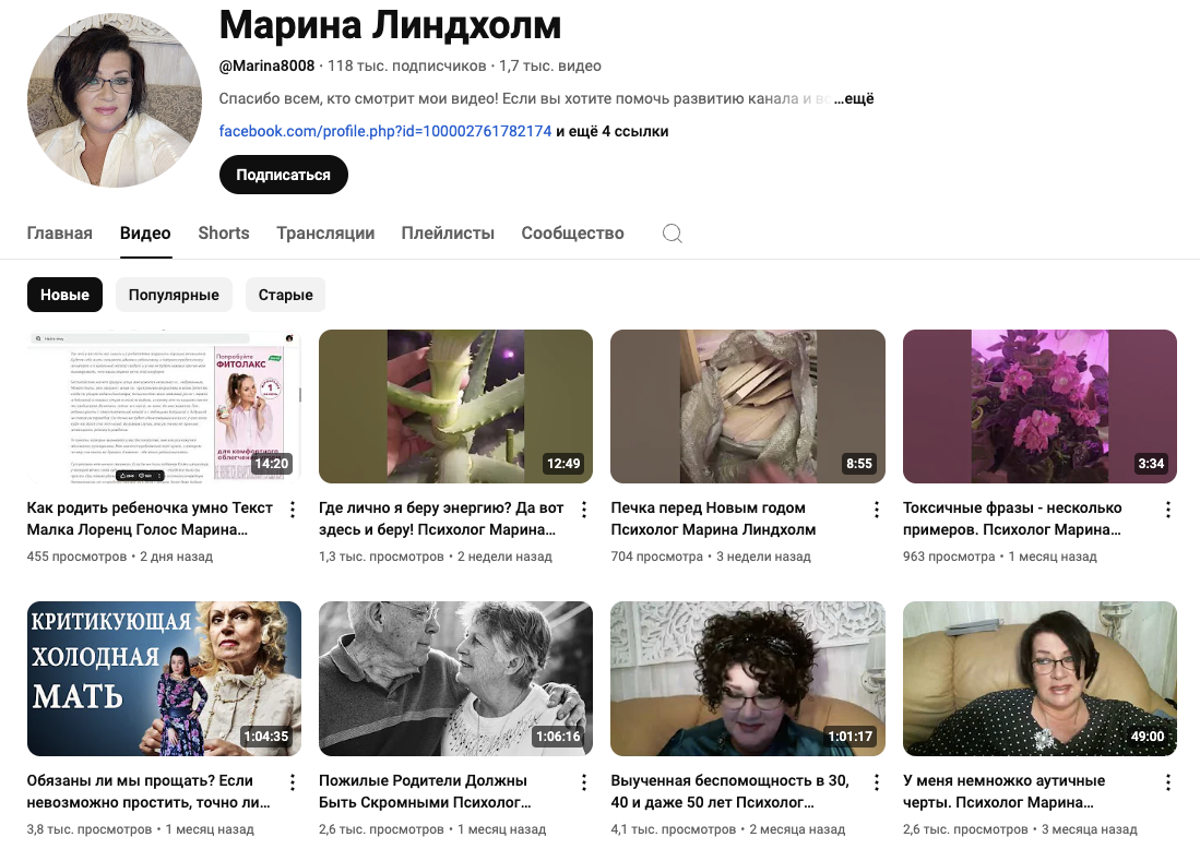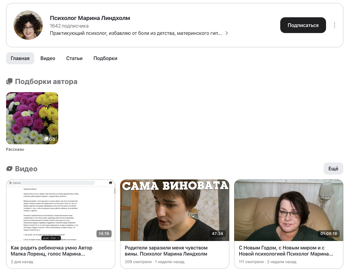 На аккаунт «Психолог Марина Линдхолм» в Дзен, на 22 января 2025-го года, подписано около 1,65 тысяч пользователей. Новые материалы на нем выходят примерно раз в 1-2 недели.