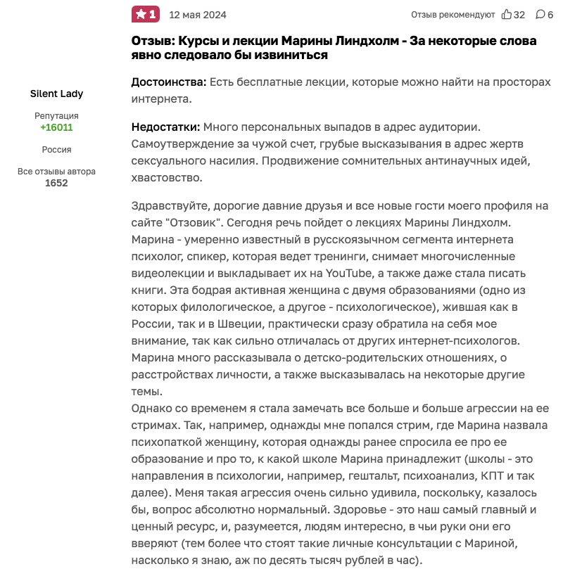 Отзывов о Марине Линдхолм в интернете немного. Предполагаем, что это связано с тем, что данный «специалист» имеет небольшую известность.