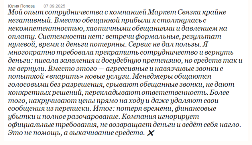 По открытым отзывам о курсе «Маркет Связка» тон в основном отрицательный. Главная претензия – разрыв между рекламой и реальным содержанием. Люди пишут, что заявленные «100 тысяч в месяц» недостижимы. Многие называют эти обещания обманом. Материалы кажутся поверхностными и повторяют то, что есть бесплатно в сети. Много жалоб на агрессивный маркетинг. Давление, триггеры «последний шанс», навязчивые призывы оплатить прямо сейчас. Это отталкивает и снижает доверие. Отдельно ругают ссылку на ФЗ‑149 как «отказ от ответственности». Покупатели видят в этом попытку защититься от претензий.