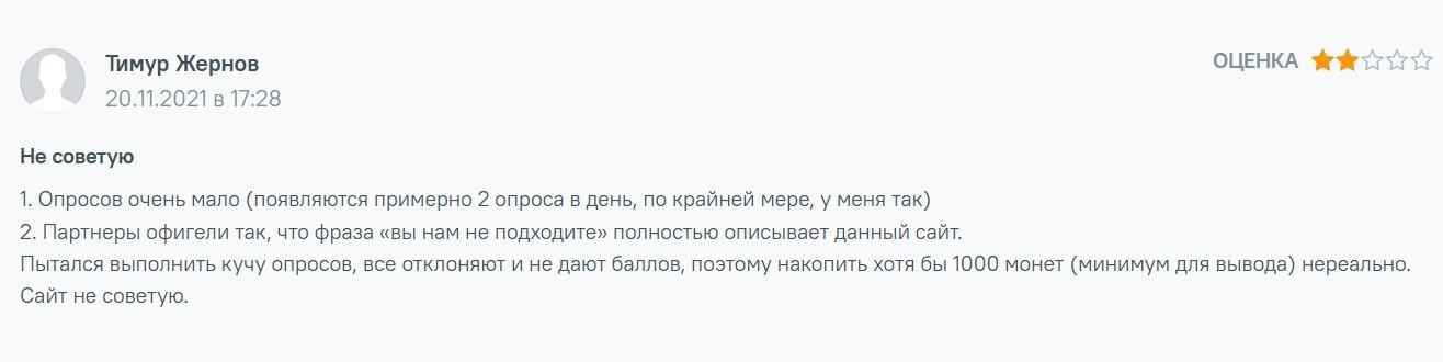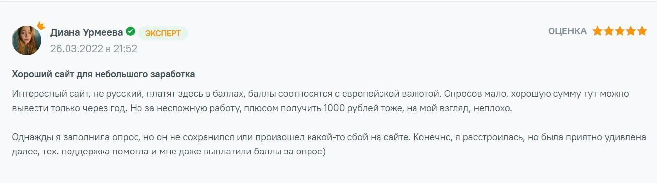 Участие в опроснике добровольное. За отказ от заполнения анкеты наказание не предусмотрено. За каждое выполненное задание начисляются баллы, которые потом можно обменять на реальные деньги. Тарифы на сайте не описаны. Минимальная сумма вывода – 200 баллов. Дополнительно можно зарабатывать, привлекая новых участников в проект.