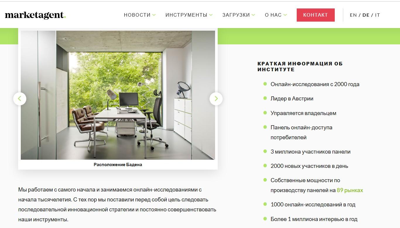 Компания Marketagent оказывает услуги на сайте marketagent com. Она проводит цифровые исследования рынка, проводит опросы населения по разным тематикам. Работает почти по всему миру. Занимает лидирующие позиции в этой сфере в Австрии. Число участников – свыше 3 000 000 человек, онлайн-исследований в год – от 1 000 и интервью – от 1 000 000.