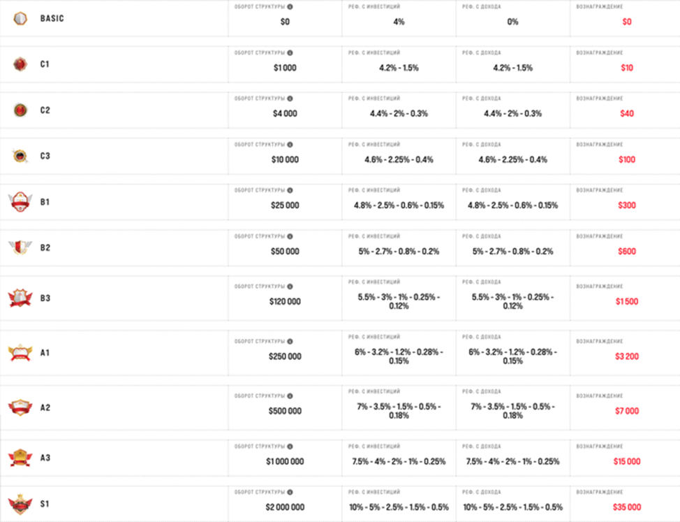 У «Марссес» есть реферальная программа, позволяющая зарабатывать на привлечении пользователей. Достаточно рекомендовать ресурс, чтобы получать 4-10%. От оборота структуры зависит доход – больше будет не только процент от вкладов друзей, но и сумма от их прибыли. Поэтому на сервис выгодно приглашать как можно больше пользователей.