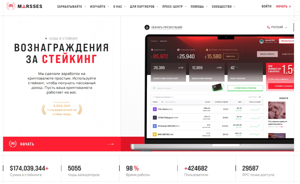 Сайт «Марссес» имеет профессиональный и аккуратный вид, поэтому сразу привлекает пользователей. Но по внешнему виду не стоит судить о надежности площадки. В основу интерфейса входит домашняя страница. Там располагаются привлекательные графики роста доходов и обещания завышенных процентов. Вся информация яркая и понятная, но нет юридических данных.
