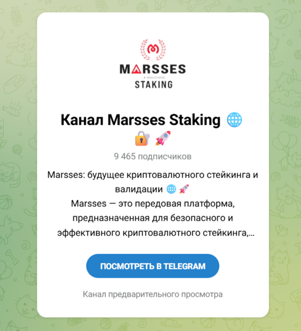 У инвестиционной платформы есть сообщество в Телеграме – Marsses Channel. Стать подписчиками канала могут все желающие. Там публикуются интересные материалы по поводу работы инвестиционной площадки. Через сообщество можно узнавать и актуальные новости. Канал Marsses Staking Channel позволяет обмениваться информацией с другими пользователями.