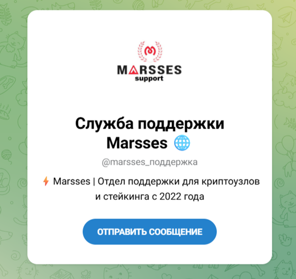 У инвестиционной площадки есть служба поддержки – marsses support. Это телеграм-канал, предназначенный для обращения пользователей. В сообщество можно обращаться по любым вопросам и проблемам.