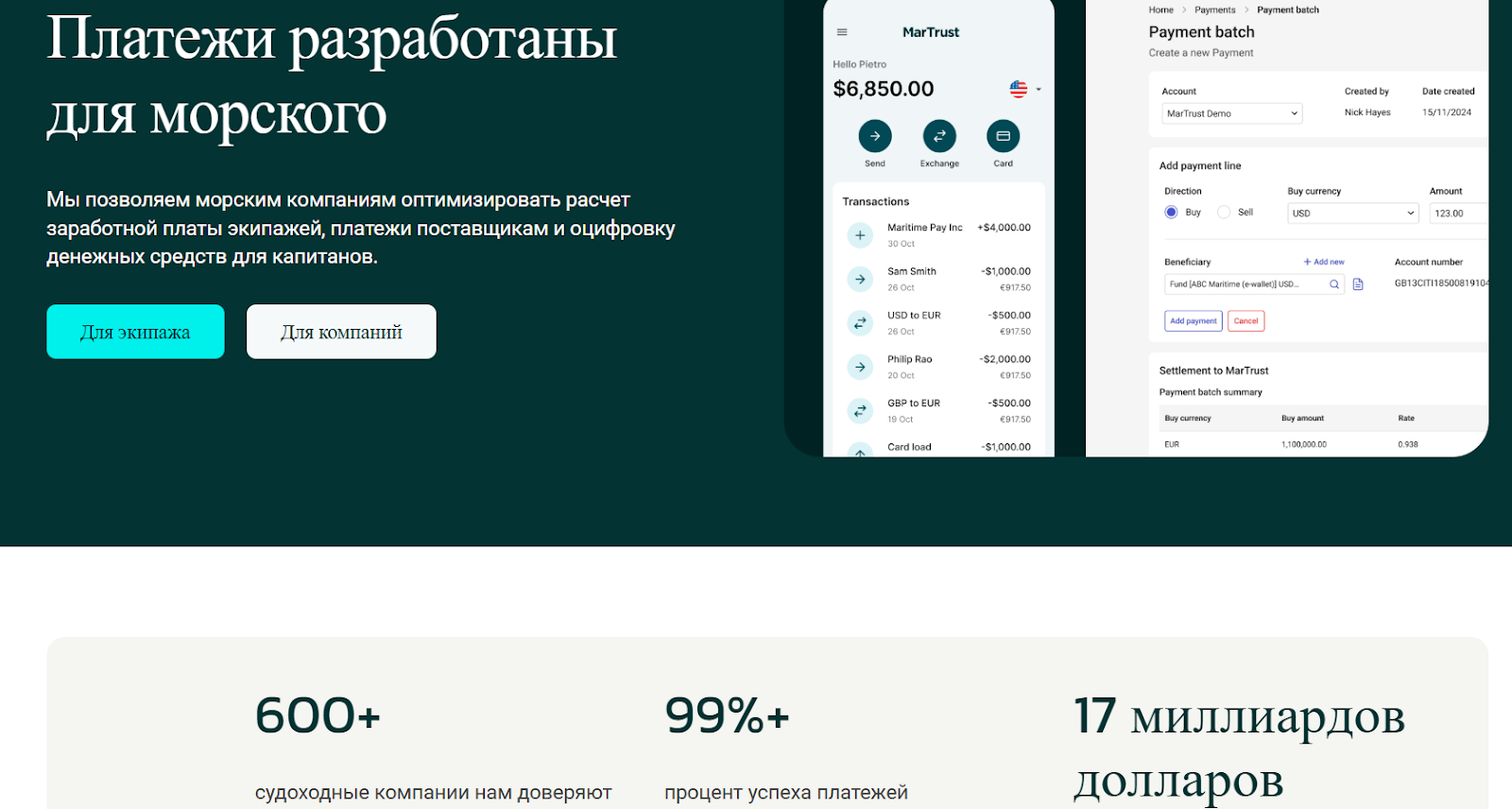 Martrust – электронный платежный сервис для морской индустрии, который используют судоходные компании и экипажи по всему миру для выплаты зарплат и международных переводов.