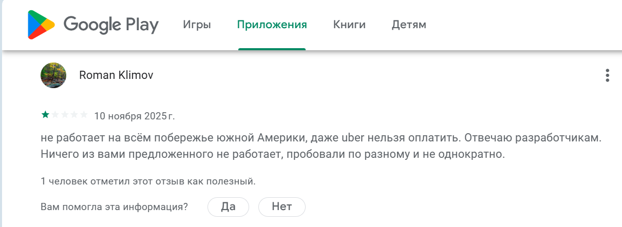 Клиенты упоминают сложности с работой приложения. В Google Play есть отзывы о том, что платформа не работает в отдельных регионах и невозможно оплатить даже базовые сервисы вроде Uber.