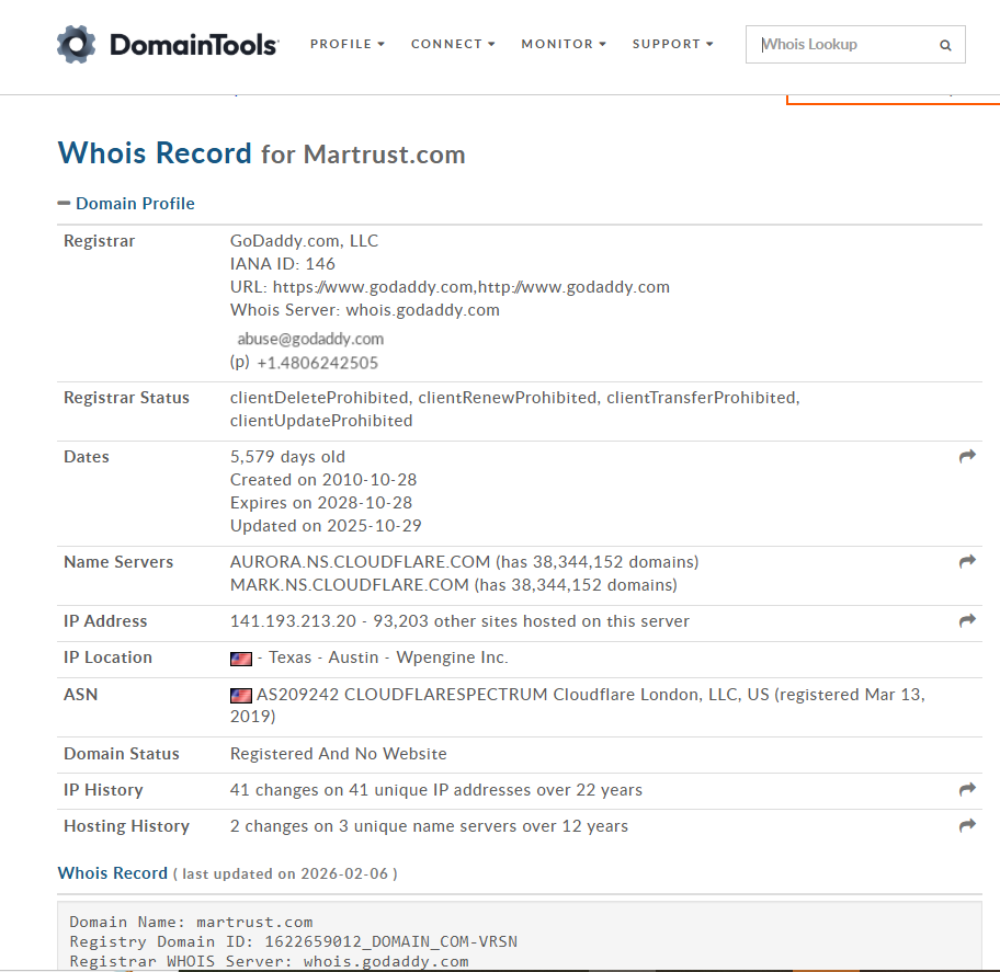 По данным Whois домен Martrust com зарегистрирован в октябре 2010 года и существует 15 лет.