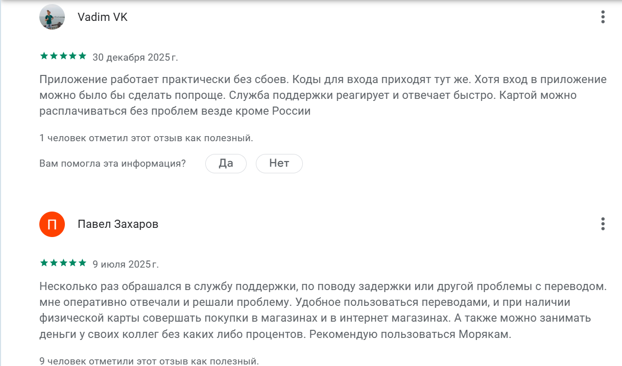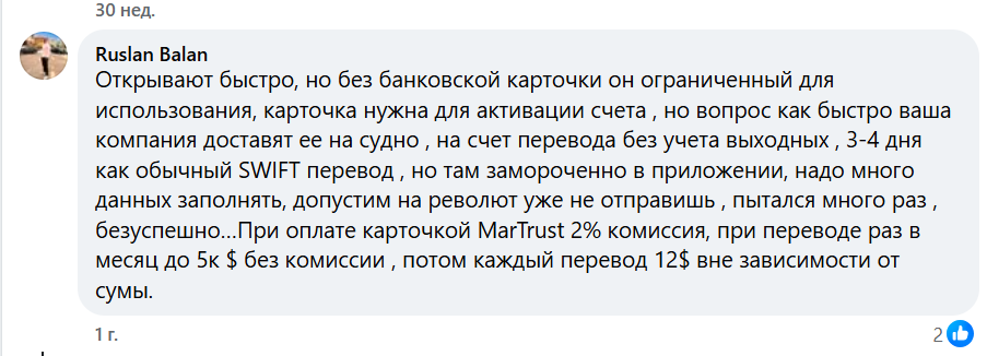 Некоторые моряки подчеркивают удобство разделения счета и карты. Деньги могут лежать на счете, а на карте будет 0, что повышает безопасность, если ее потерять.Негативная часть отзывов об электронном кошельке для моряков «Мар Траст» связана с блокировками счетов и заморозкой денег. Некоторые пользователи пишут, что счет могли закрыть без уведомления, а при обращении в поддержку им сообщили, что вся ответственность на посреднике.