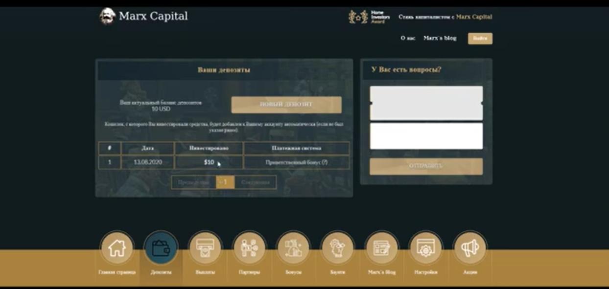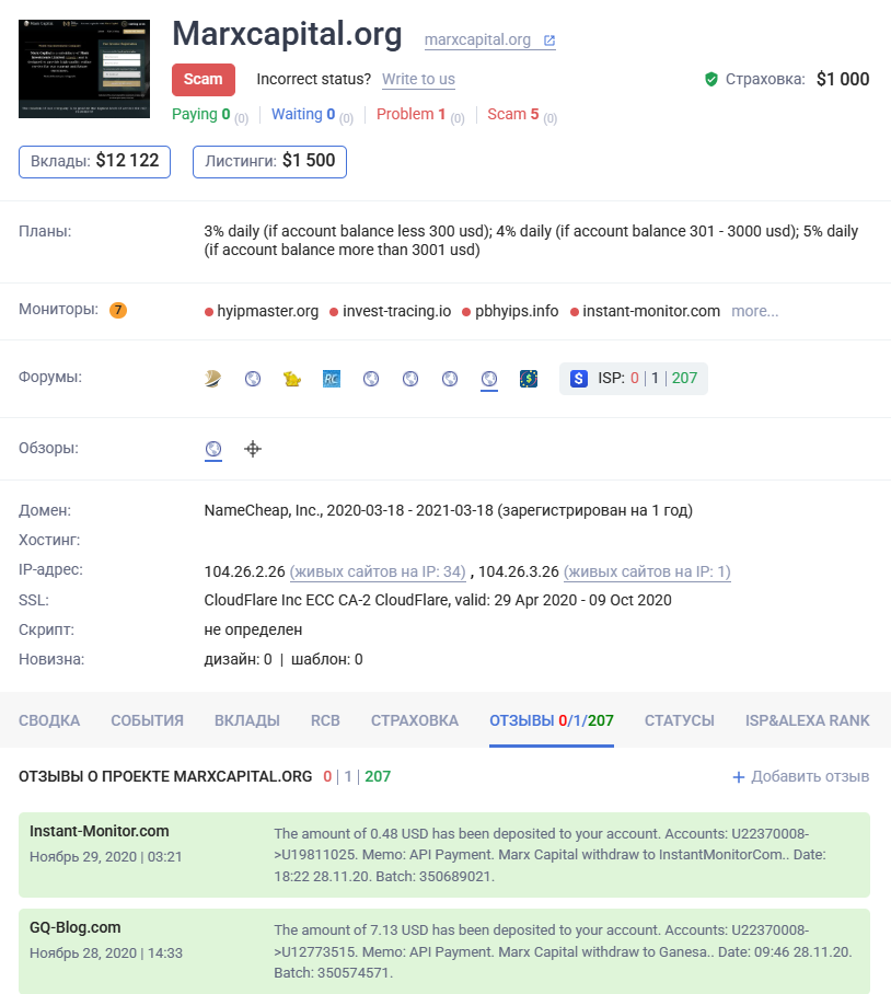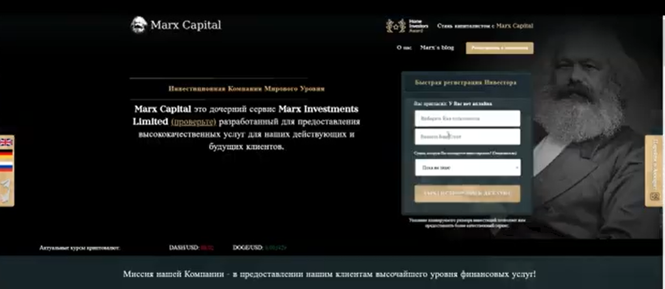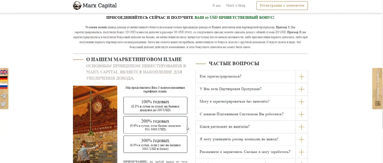 Инвестиционный хайп проект MarxCapital org был очень популярен и действительно платил инвесторам в 2020 году. Зарубежная платформа работала с ценными бумагами, предлагала услуги по созданию инвестиционной стратегии выгодного долгосрочного инвестирования.