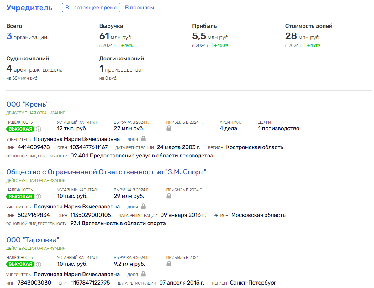 Наличие у создателя курса Прибыльный канал в Телеграм Марии Полуяновой регистрации ИП говорит о легальности работы, но мы хотим отметить, что эксперт по каналам является учредителем еще в трех бизнесах с общей прибылью 5,5 млн рублей за 2024-й год. Из сомнительных моментов отметим 4 суда ее компаний, а также 1 долг.