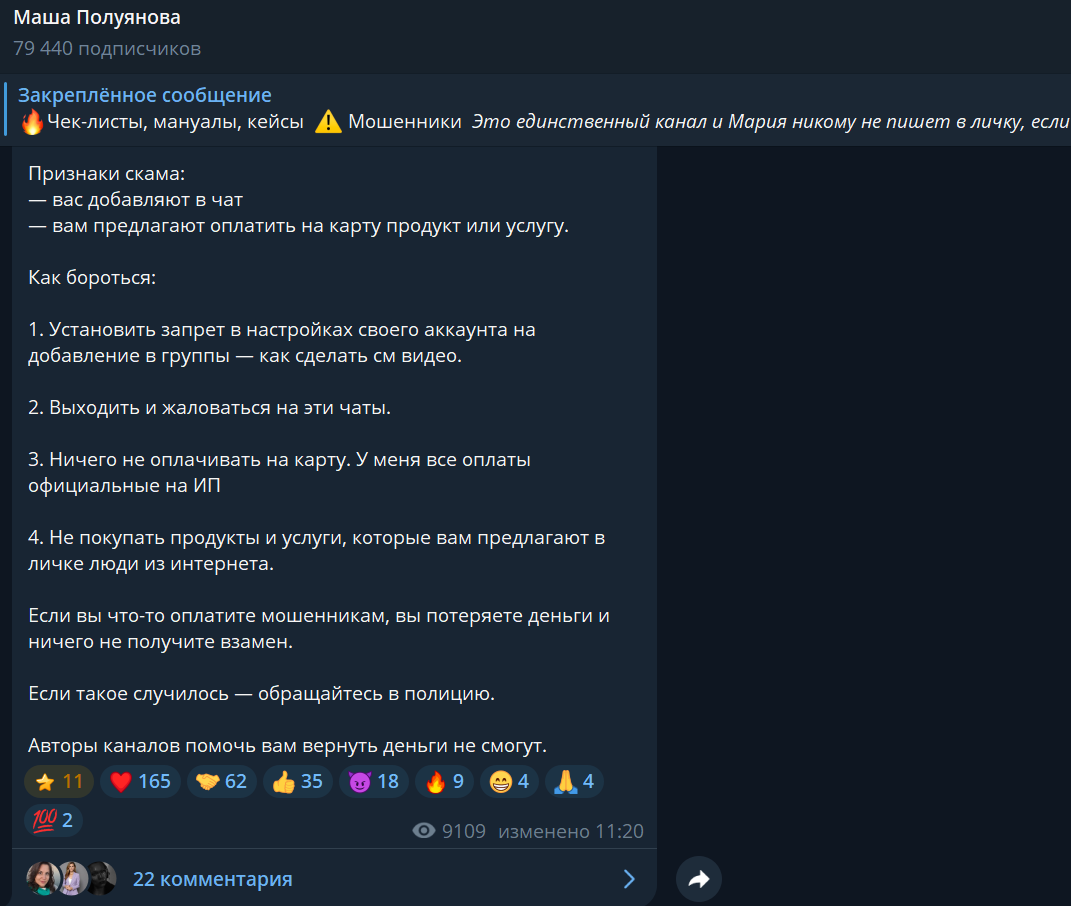 В телеграм-канале MashaPoluyanova почти 80 тыс. подписчиков, что является неплохим результатом. Однако вспомним, что Мария консультирует именно в данной сфере, при этом такие показатели за 7+ лет не являются особенно выдающимися. Если же обратить внимание на просмотры, то заметно, что основная аудитория неактивна, а за публикациями следят около 10 тыс. человек.