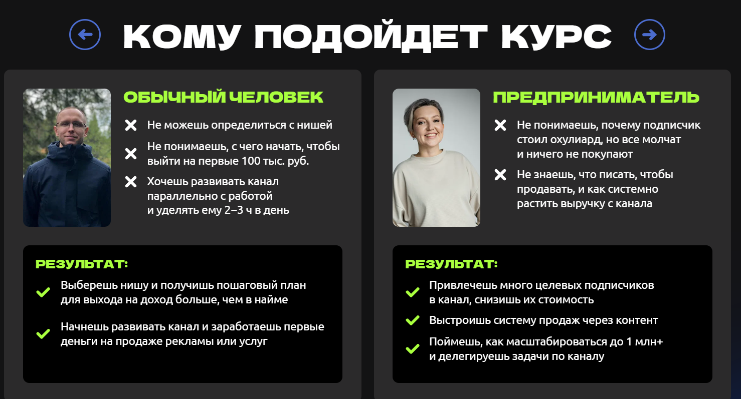 Раздел “Кому подойдет курс” здесь Мария Полуянова явно добавила с целью попасть в абсолютно любую аудиторию. И действительно, подойдет он якобы как обычному человеку, так и эксперту или предпринимателю.