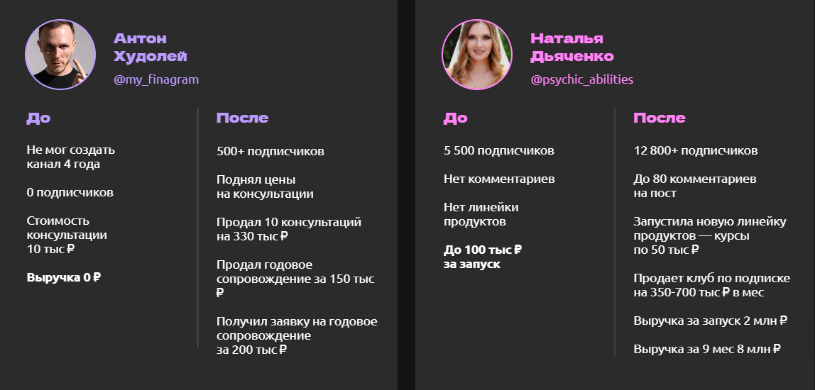 Результаты учеников курса Прибыльный канал в Телеграм тут тоже есть, даже оставлены ссылки. Но если обратить внимание на показатели, то мы, по сути, можем подтвердить прибавку в подписчиках, которая зачастую и не особо значительна. Данные о том, кто и сколько на этом заработал, верифицировать невозможно.