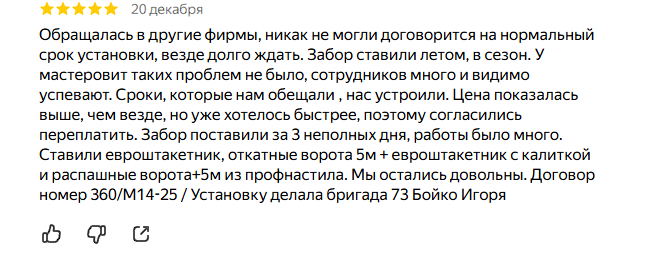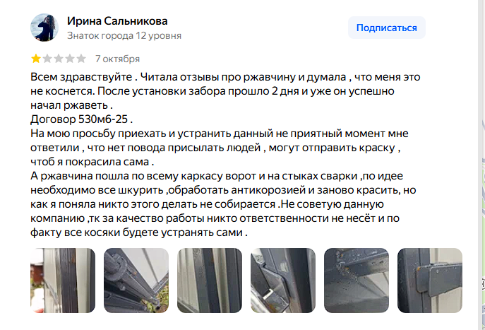 С другой стороны, масштаб компании ещё не значит, что она – лучшая. Судя по отзывам, качество услуг “Мастеровита” зависит от конкретной бригады, замерщика или менеджера. Одни клиенты получают аккуратно установленный забор в срок, другие сталкиваются с проблемами. В том числе с перекосами конструкций, преждевременной коррозией, дефектами покраски и сложностями при обращении по гарантии.