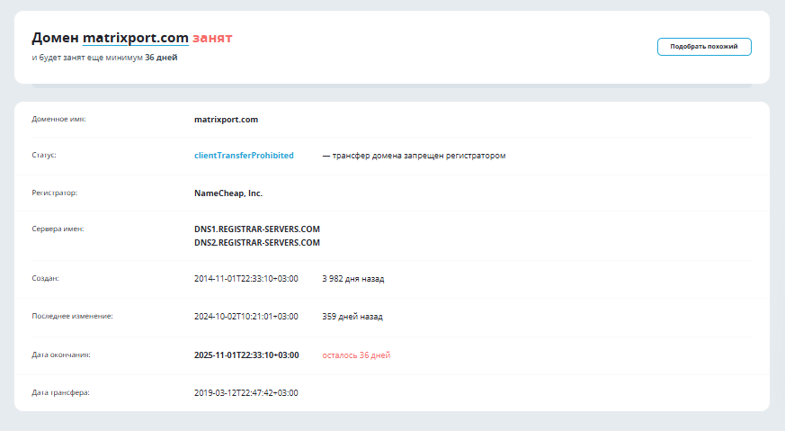 Домен зарегистрировали в 2014 году, а последние изменение было 359 дней назад. Мы заметили, что адрес будет действителен в течение 36 дней, на сентябрь 2025 года.