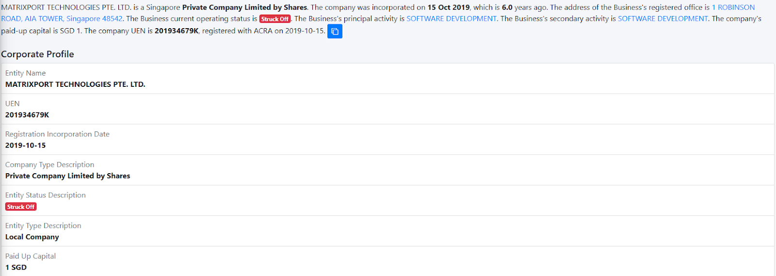 Мы нашли информацию о том, что эта компания была зарегистрирована в Сингапуре. Исходя из официальной выписки, организация была исключена из реестра ACRA, но непонятно по какой причине.