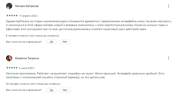 В карточке приложения на GooglePlay у биржи оценка 3.9, есть немало положительных отзывов. Пользователи жалуются только на большие комиссии и возможные проблемы при выводе средств.