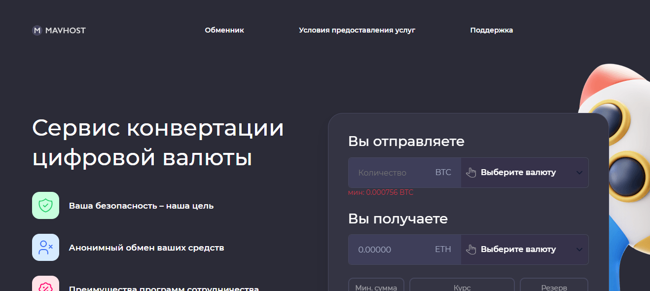 Mavhost com — это онлайн‑обменник электронной валюты, заявленный как мгновенный сервис для обмена крипты и фиата. Проект работает по малоизвестному формату: пользователь запускает заявку на сайте, после чего в Telegram происходит общение с оператором, который подтверждает курс, предоставляет реквизиты и курирует перевод. В данном обзоре рассмотрим реальные факты по функционалу, юзабилити, а также отзывам о Mavhost com, что позволит читателям сделать собственные выводы.
