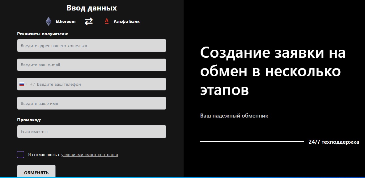 Условия для обмена максимально упрощены, проходить полную верификацию для заполнения заявки и внесения денег на счет Максфц никто не требует. После выбора направлений конвертации надо заполнить несколько полей, где указать: