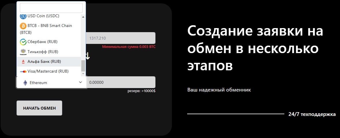 Выбор направлений для обмена небольшой, доступно около 20 криптомонет которые можно конвертировать, а также фиатный рубль. Совершить рублевые обмены с/на можно с помощью карты Мастеркард/Виза или банковских счетов в Сбербанк, Тинькофф, Альфа банк. Чтобы не утруждать себя указанием резервов, как обычно делают хорошие сервисы, владельцы просто указали, что больше 10000$.