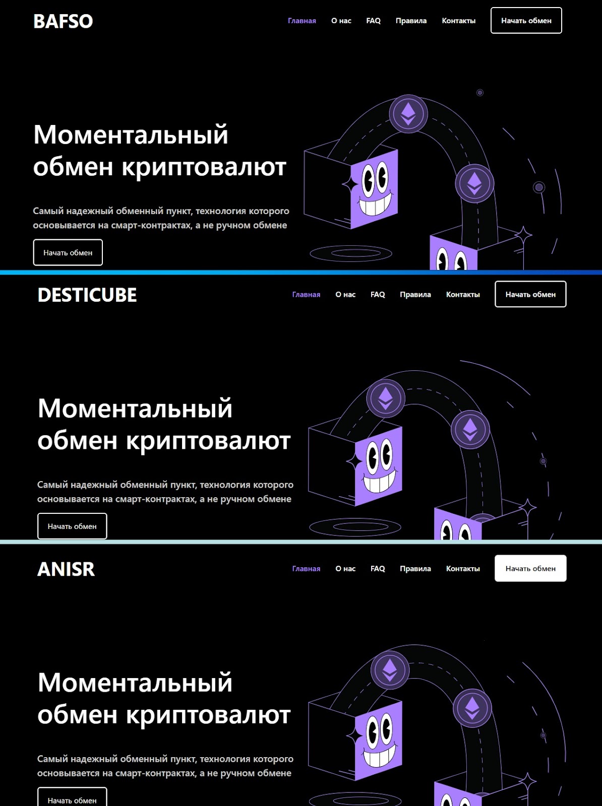Дальнейшая проверка показала, что обменный пункт Maxfc далеко не единственный. У него большое количество клонов. Очевидно, что здесь работают аферисты, которые создали большое количество дубликатов своего обменника-шаблона. Как только на работающий сервис начинают поступать жалобы, они его удаляют и запускают в сеть следующий. Такой, своего рода, конвейер, например, Desticube, Anisr, Bafso.