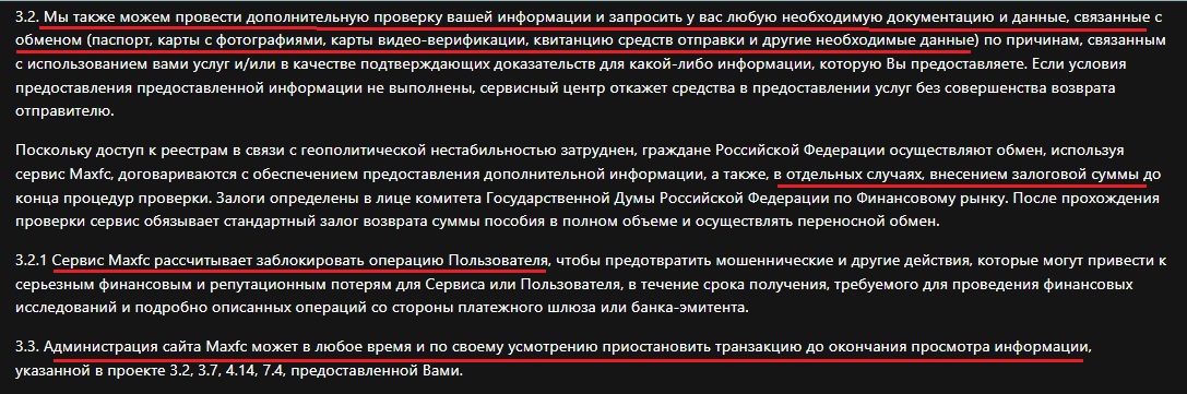 На Правила пользования стоит обратить особое внимание. В них указано, что администрация имеет право в любое время заблокировать транзакцию без объяснения причин. Кроме того, может быть инициирована проверка KYC. Во время ее проведения клиентский счет блокируют. Также могут быть затребованы любые документы и внесение залоговой суммы. Сколько длится такая проверка неизвестно. Таким образом, владельцы сервиса узаконивают блокировку средств.