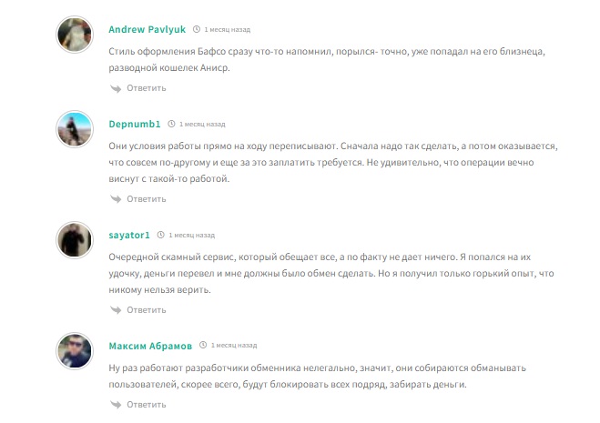 Так как обменник криптовалют maxfc com работает недолго, отзывы о нем пока не появились. Но они есть в большом количестве о его “близнецах”, что дает представление о работе сервиса. Например, в отзывах на Бафсо, экс-клиенты жалуются на блокировку транзакций и смену условий без предупреждения.