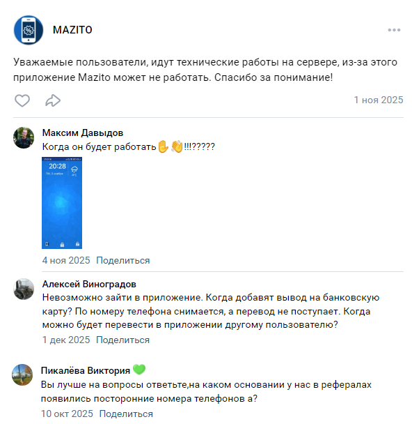 Юзеры пробуют вывести деньги из системы по номеру телефона, но сталкиваются с тем, что с баланса платформы средства снимаются, но перевод не поступает. То есть транзакции завершаются с отрицательным результатом и одновременным обнулением финансового счета. Также народ жалуется на то, что в списке рефералов самопроизвольно появляются незнакомые номера. Не меньше отрицательных комментариев зафиксировано в интернете о том, что сервис Mazito платит мизерные вознаграждения, при этом еще и пытается обмануть.