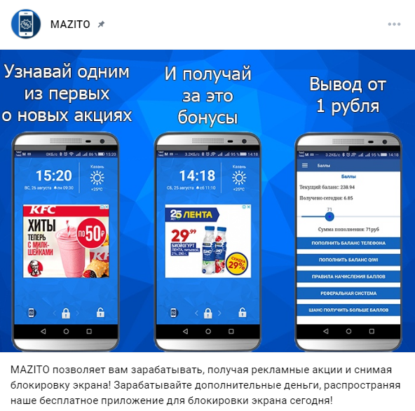 Разработчики схемы заработка предлагают публике скачать и установить приложение на мобильное устройство, дать необходимые разрешения этой программе в своем телефоне и время от времени наблюдать за появлением рекламы на экране при разблокировке аппарата. На дисплее отображаются пуши рекламных акций партнеров компании Mazito.