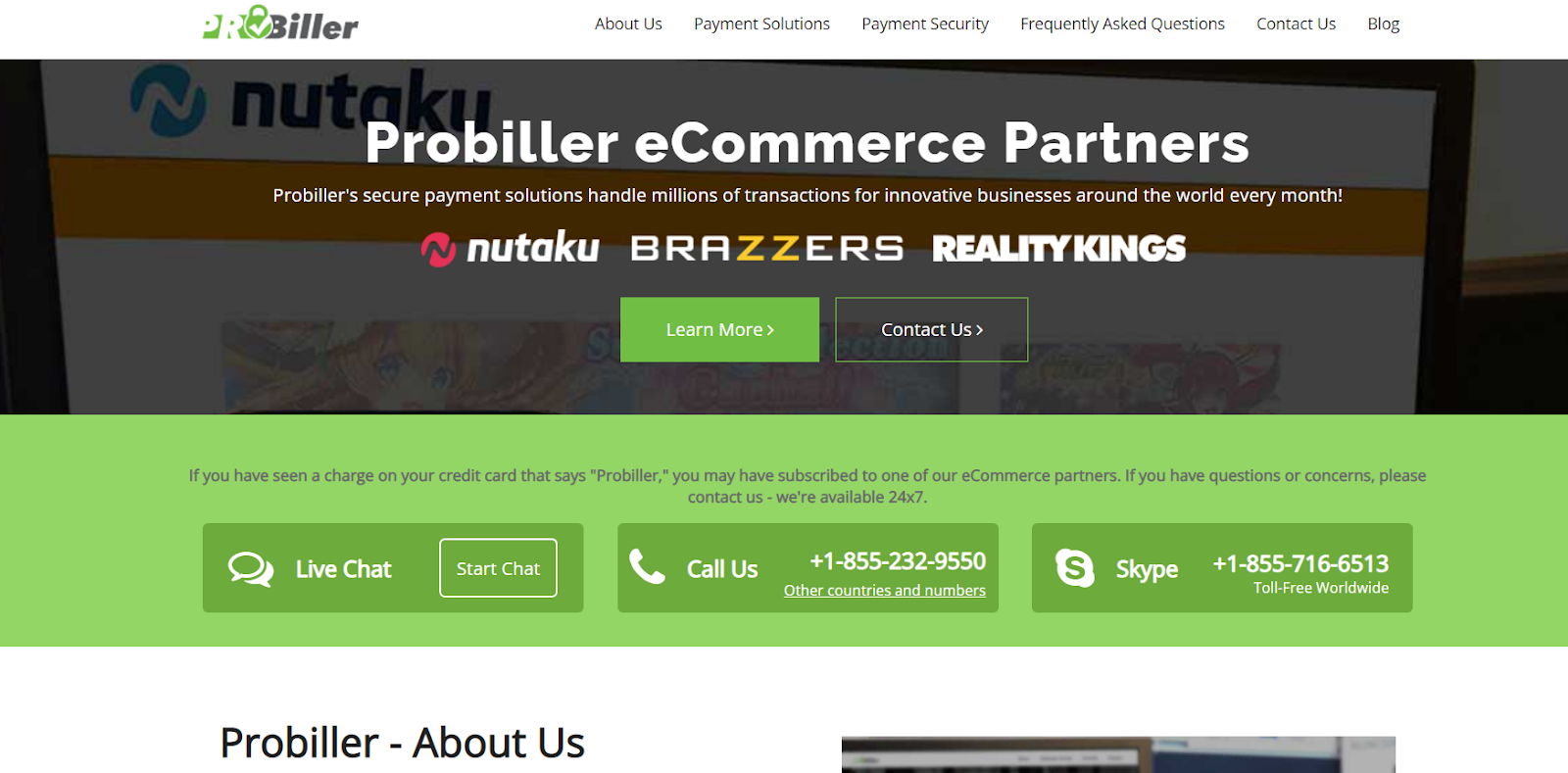 Проект работает через официальный ресурс probiller com. Он доступен на английском языке. Из разделов представлены: “О нас”, “Решения”, “Безопасность”, “Вопросы и ответы”, “Связаться с нами” и “Блог”.