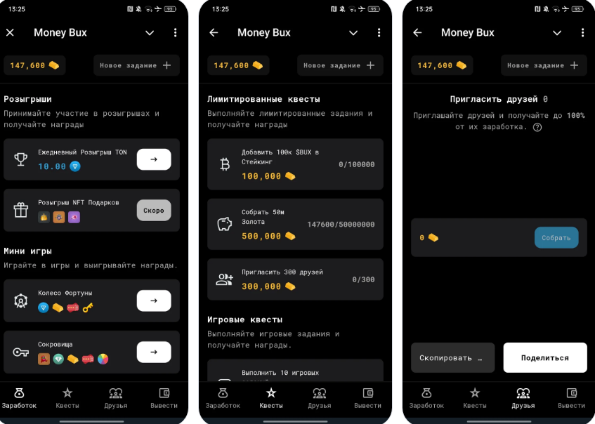 Сейчас в Телеграме появился бот с таким же названием Money Bux (mbuxbot). Людям предлагают зарабатывать TON на выполнении легких заданий. Например, пользователи могут получать монеты за мини-игры, участие в стейкинге крипты, розыгрышах и т.д.