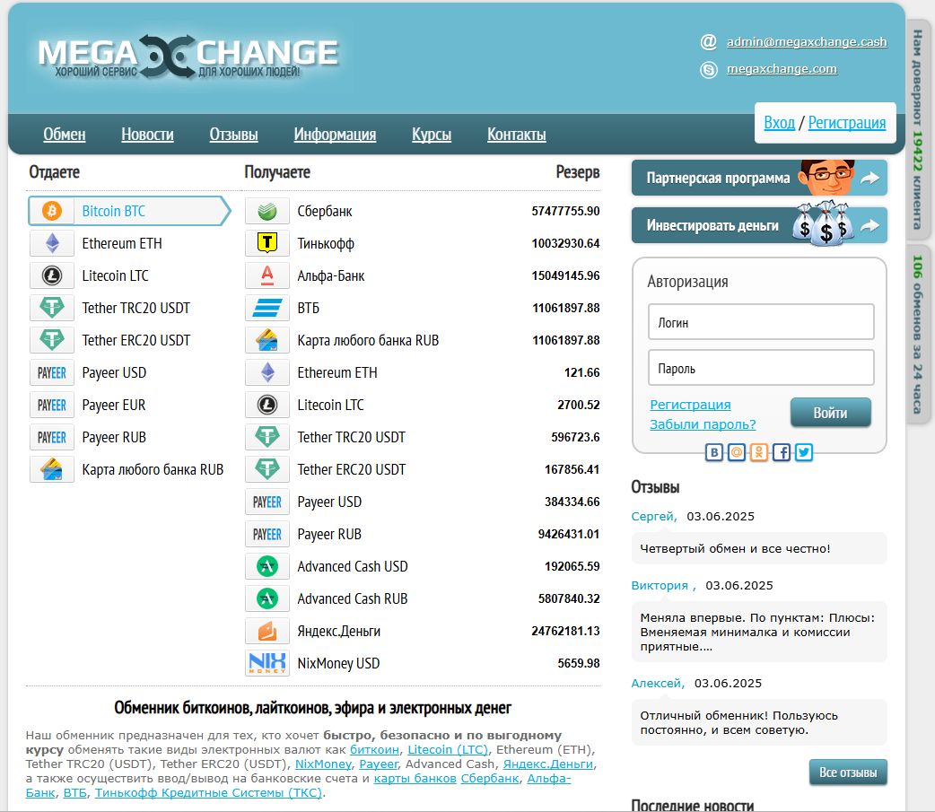 MegaXChange – это онлайн-обменник, который предлагает услуги по обмену различных электронных валют, криптовалют и фиатных средств. Отзывы о MegaXChange сильно контрастируют с его положительным имиджем, поэтому мы решили провести собственное расследование, изучив работу сервиса и тарифы.