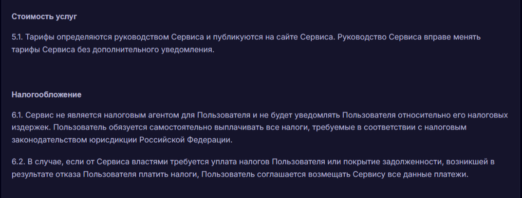 Пункт 6.2 пользовательского соглашения позволяет владельцам обменника взимать с посетителей скрытые платежи. На основании него всегда можно заставить клиента оплатить несуществующую задолженность, которая якобы образовалась после уплаты налогов властям.