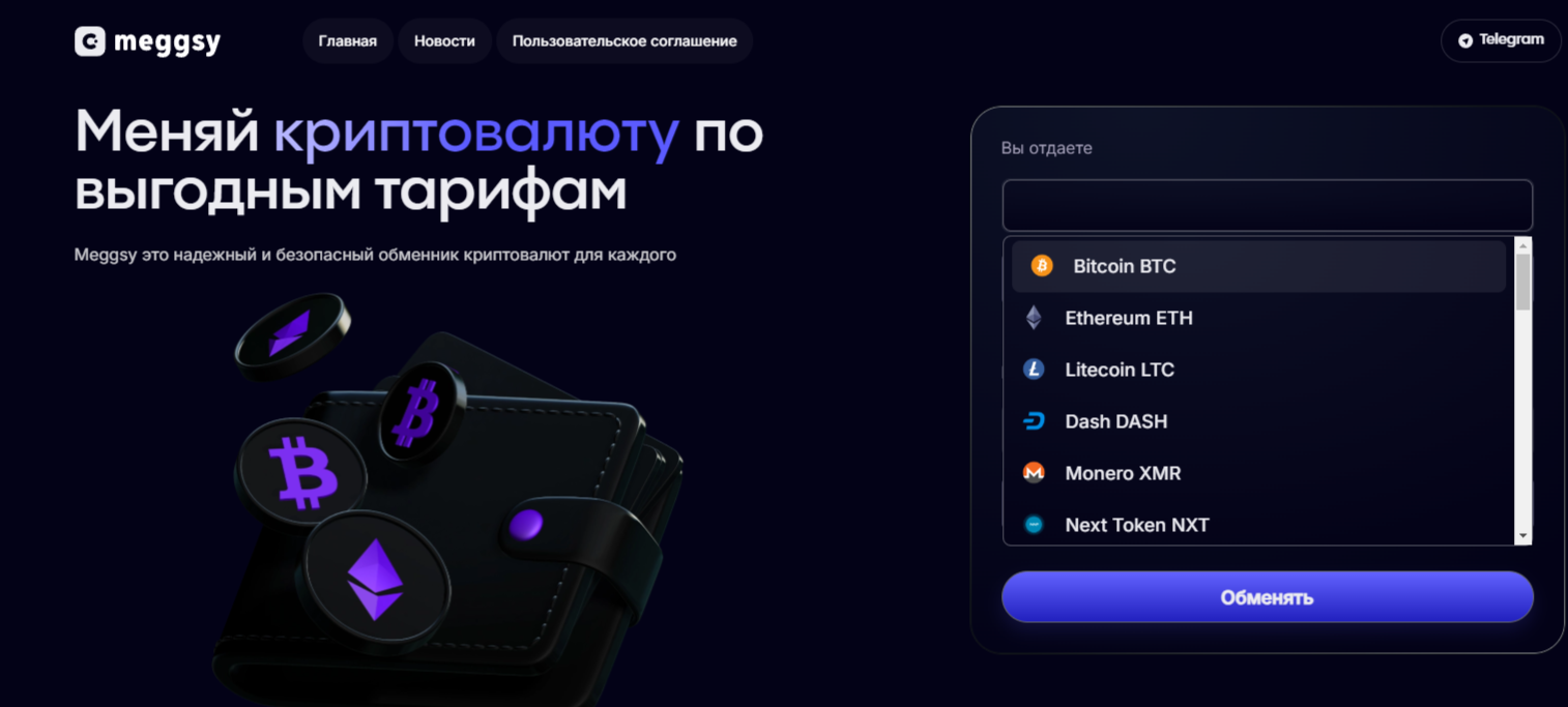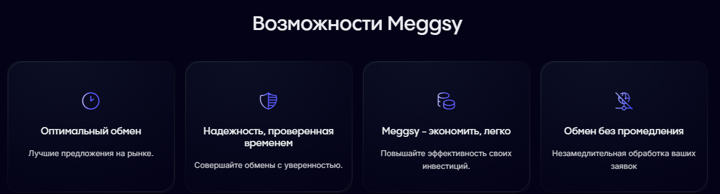 На официальном сайте Meggsy размещен сервис, который занимается обменом криптовалюты по выгодному курсу. Здесь можно быстро и безопасно поменять Monero, Bitcoin, Stellar, Cardano и другие цифровые деньги. Всем своим клиентам крипто-обменник обещает: