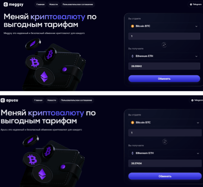 Дизайн официального сайта крипто-обменника прост и лаконичен. Главная страница содержит разделы «Главная», «Новости», «Пользовательское соглашение» и рекламу преимуществ сотрудничества. На портале не найти вкладки «Лицензии и сертификаты», нет информации о регистрации компании. Портал meggsy com идентичен ресурсу apuku com, который недавно был выставлен на продажу. Возможно, в связи с ростом негативных отзывов обманутых клиентов.