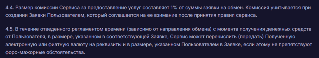 Комиссионный сбор Meggsy не отличается от других крипто-обменников и составляет 1%. Комиссия автоматически начисляется во время формирования заявки на обмен. На основании пункта 5.1 пользовательского соглашения клиент может, даже не подозревая, оплатить более высокий процент сбора, так как администрация в любой момент имеет право увеличить тарифы.