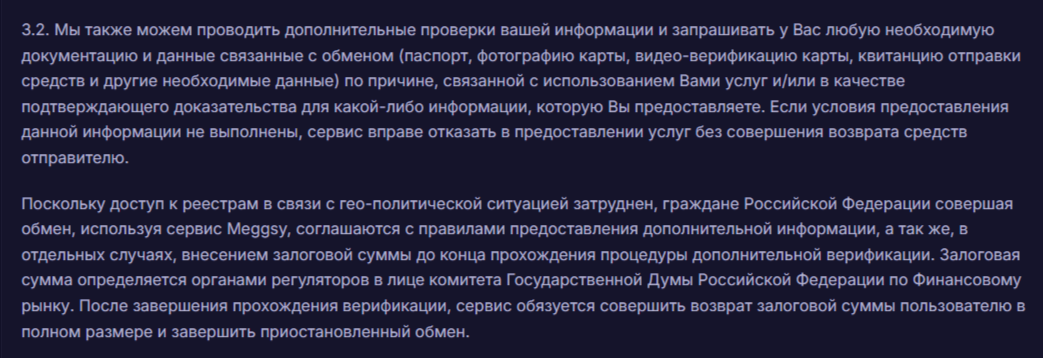 Финансовые операции на сайте «Меггси» проводятся анонимно. Так указано на главной странице портала. Однако, это не совсем соответствует действительности. О какой анонимности может идти речь, если в пользовательском соглашении имеется пункт 3.2. На основании данного пункта жители РФ обязаны предоставить скрины паспорта, банковской карты и другую информацию администрации, в противном случае сервис вправе отказать в предоставлении услуг без возврата средств.