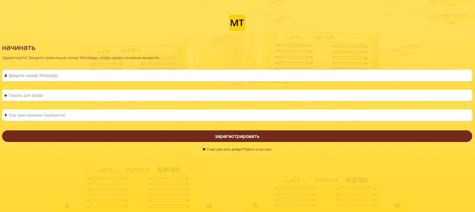 Здесь сразу же можно перейти к регистрации, но так просто создать аккаунт не выйдет. Помимо номера в WhatsApp и пароля, от посетителя требуют код приглашения. Его, видимо, может передать только менеджер организации или другой клиент. Приватный характер настораживает: часто мошенники закрывают свои ресурсы, чтобы их быстро не заблокировали. Также непонятно, почему человек вообще должен проходить регистрацию, если ему ничего не известно о сервисе.